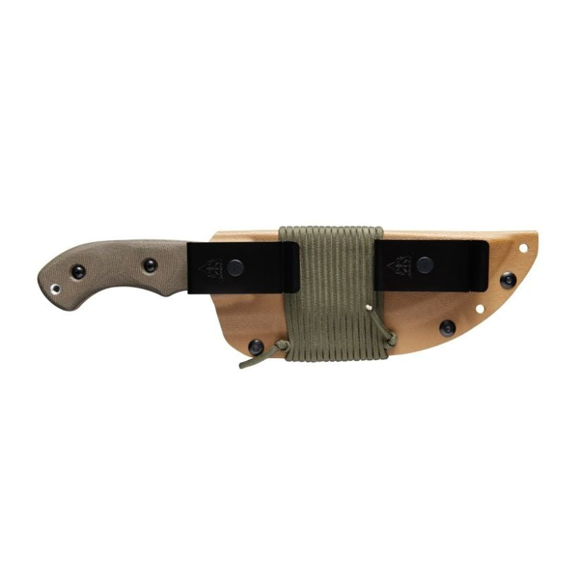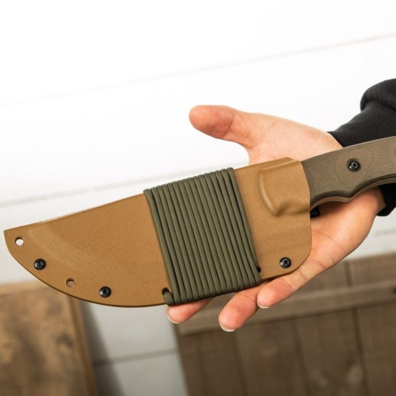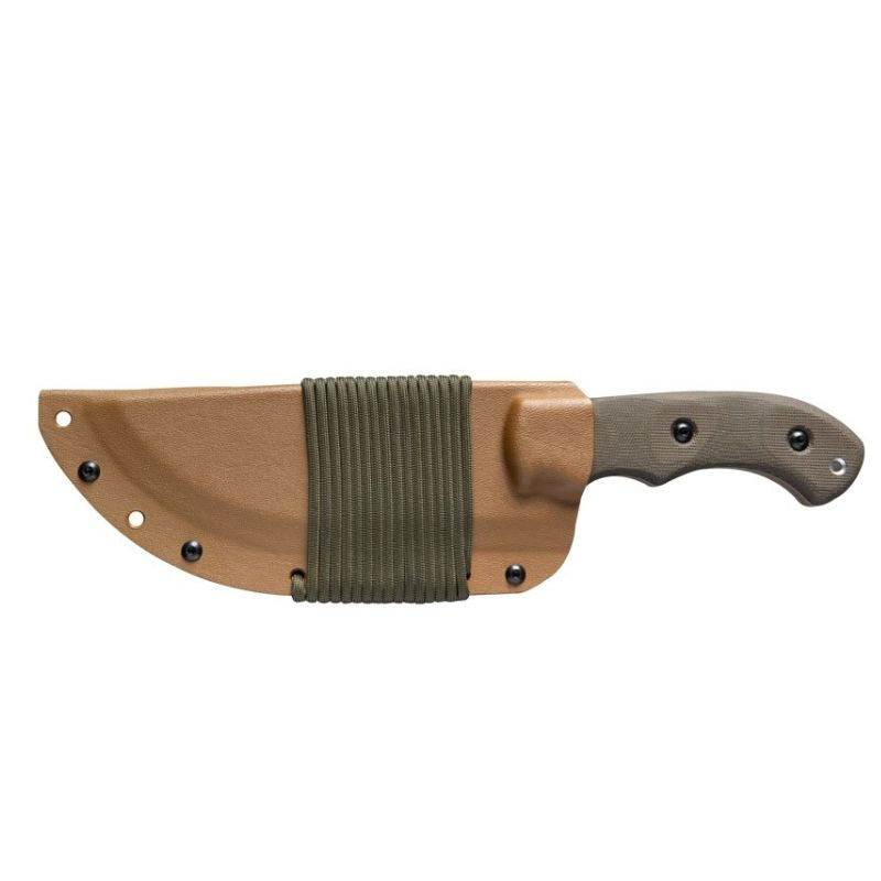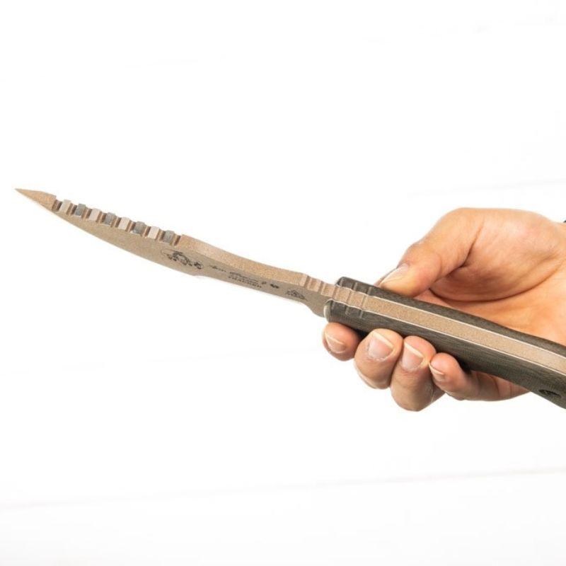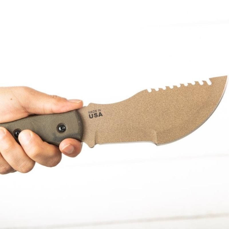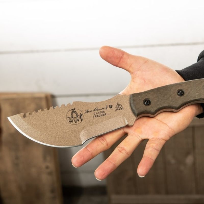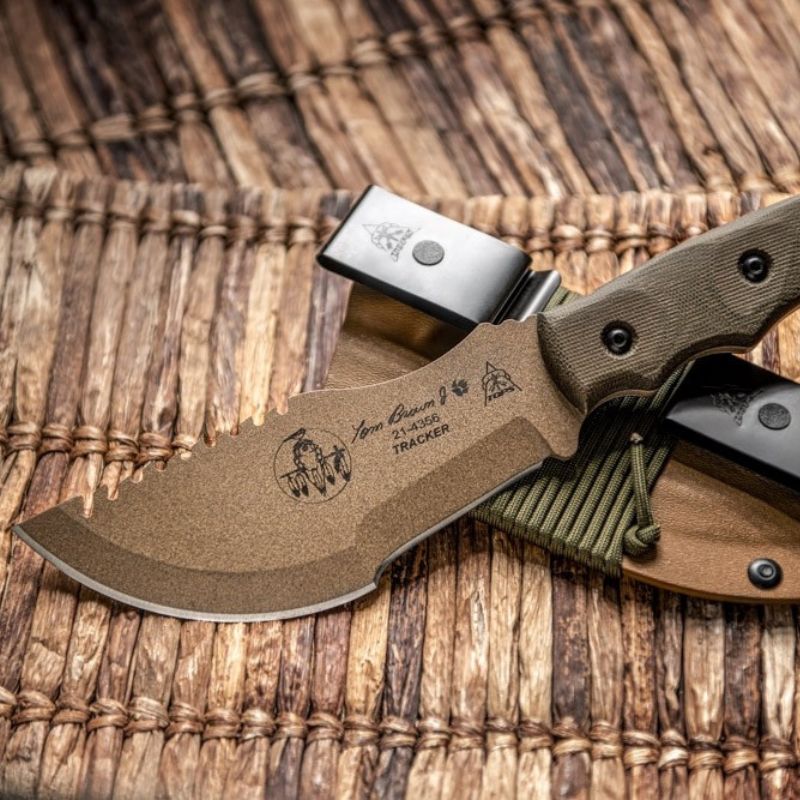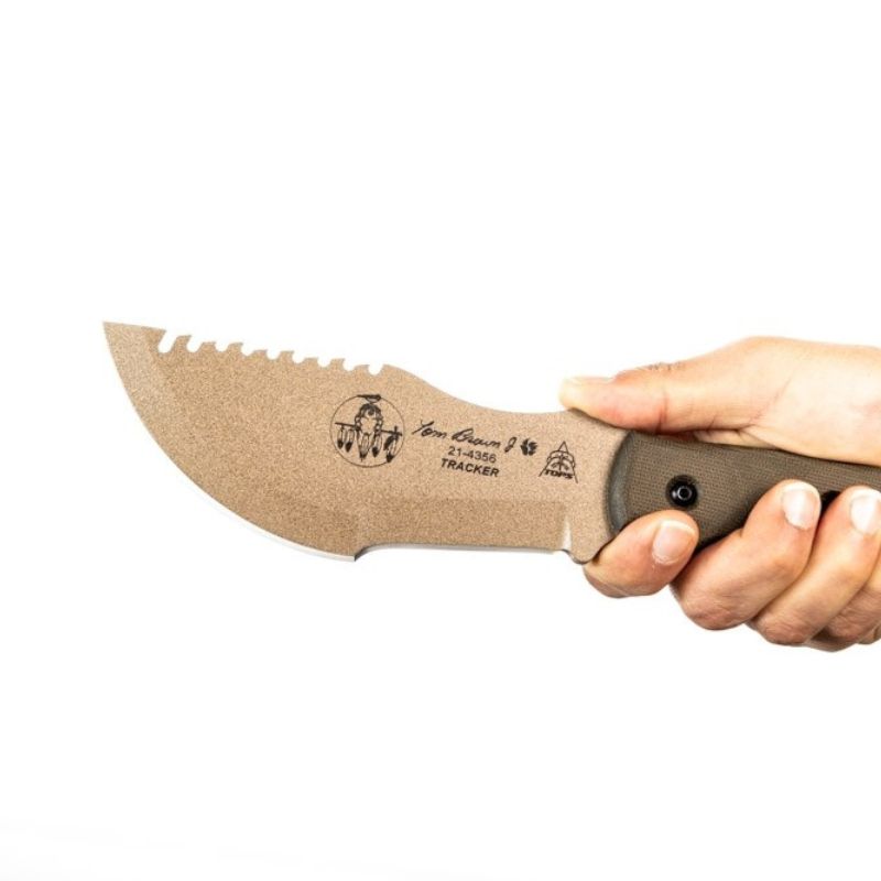 Designed & endorsed by Tom Brown Jr. himself, and featured in the movie "The Hunted" as well as on the cover of Blade Magazine. This design was made for chopping, skinning, carving, gutting, scoring, cutting, slashing, slicing, and just about anything else you would need to do in the wilderness.  The Coyote Tan version of the Tracker has a Coyote Tan traction coated 1095 tool steel blade. This is one of the most versatile knives we stock and can be used to chop, pry, skin and saw. This knife has a coyote tan linen micarta handle and lanyard hole.
