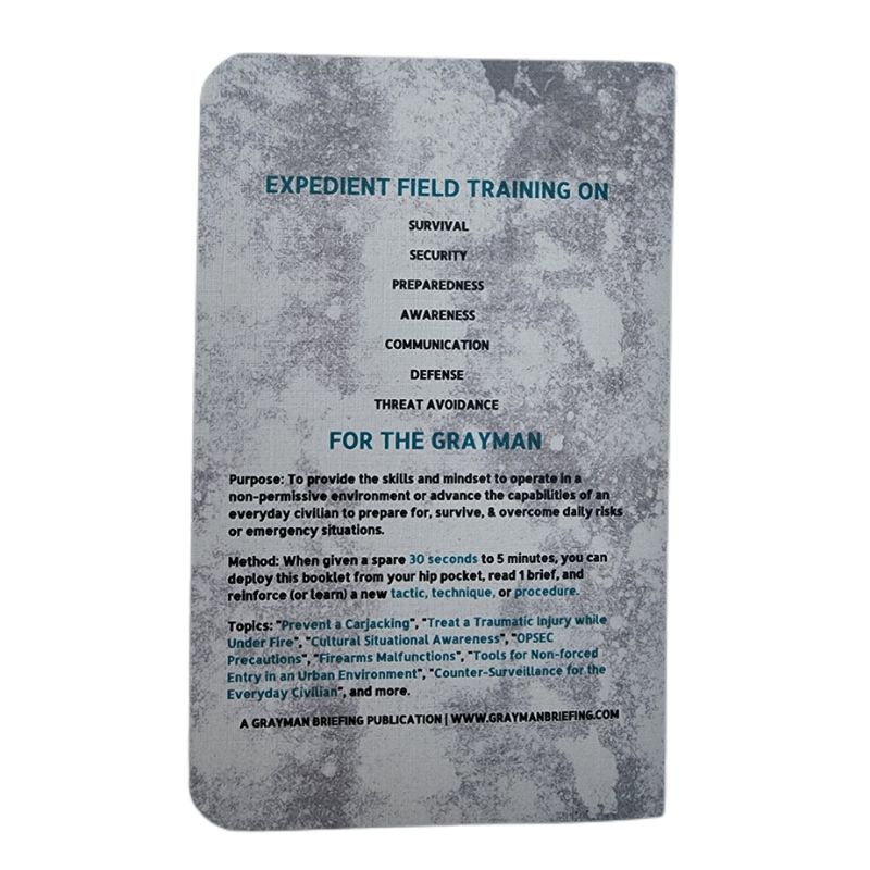 The Hip Pocket Brief Vol 1 features 40 short training sessions meant to be read and understood in less than a minute while providing enduring actionable Tactics, Techniques, and Procedures (TTPs) on topics that increase your knowledge to evade threats, prepare for disaster, react to emergencies, detect covert behaviors, survive a crisis, and collect intel.