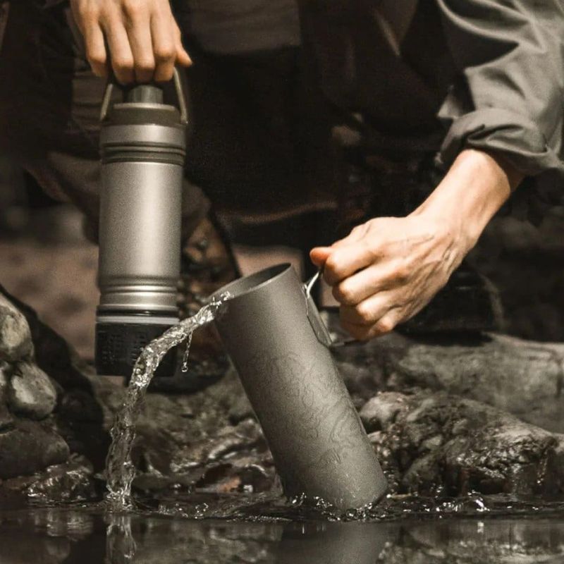 Behold the most versatile water purifier ever dreamt, let alone built! The world's first titanium filter bottle provides unparalleled strength to weight ratio and meets the most challenging rigors of the outdoors. The Outer Ti Cup can be used to heat water and cook food near a fire or on a camp stove. The .5L UltraPress® Titanium Water Filter & Purifier Bottle provides complete global protection from virus, protozoa, bacteria, particulates, chemicals, pesticides, herbicides and heavy metals.