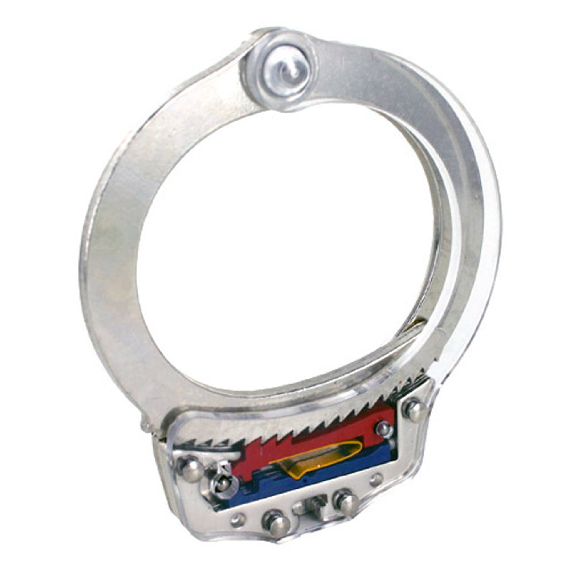 A single handcuff with Plexiglas cover that allows you to see the shim slide between the ratchet and the teeth of the handcuff, releasing the locking mechanism. Allowing you to see and learn a handcuffs inner workings. Works with all standard handcuff keys. Includes one standard handcuff key.