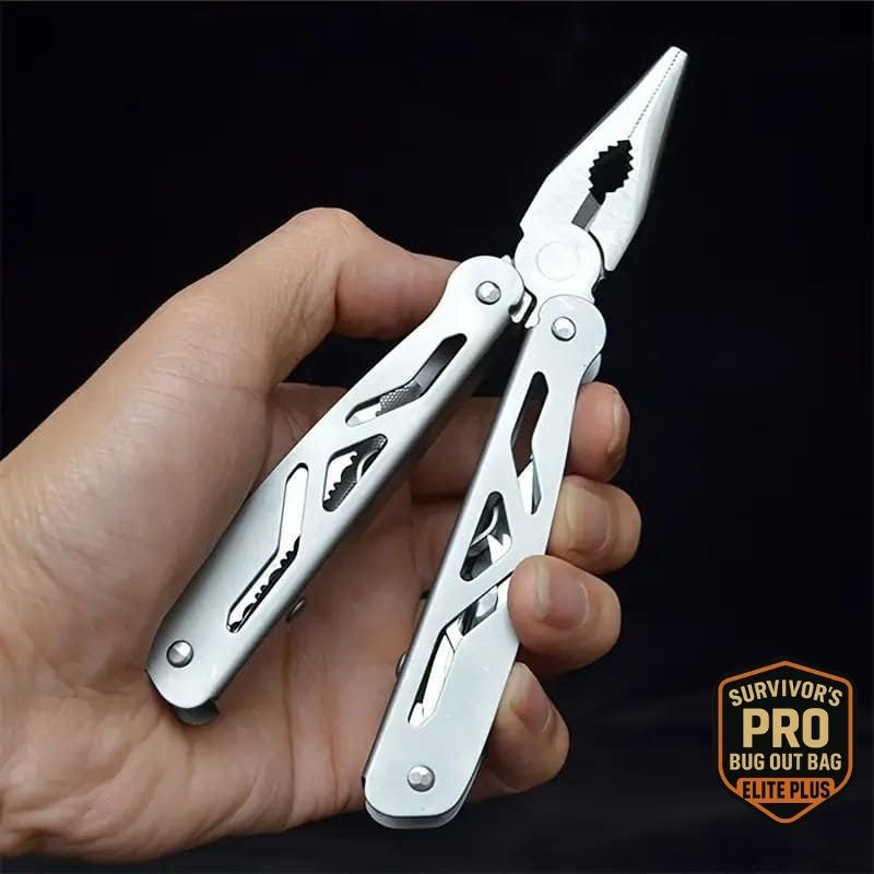 Multitool - Stainless Steel with 12 tools: Needle nose pliers, Wire cutters, Knife, Phillips head screwdriver, Can opener, Pointed scraper, Steel file, Serrated (half-toothed) knife, Flat head screwdriver, and more.